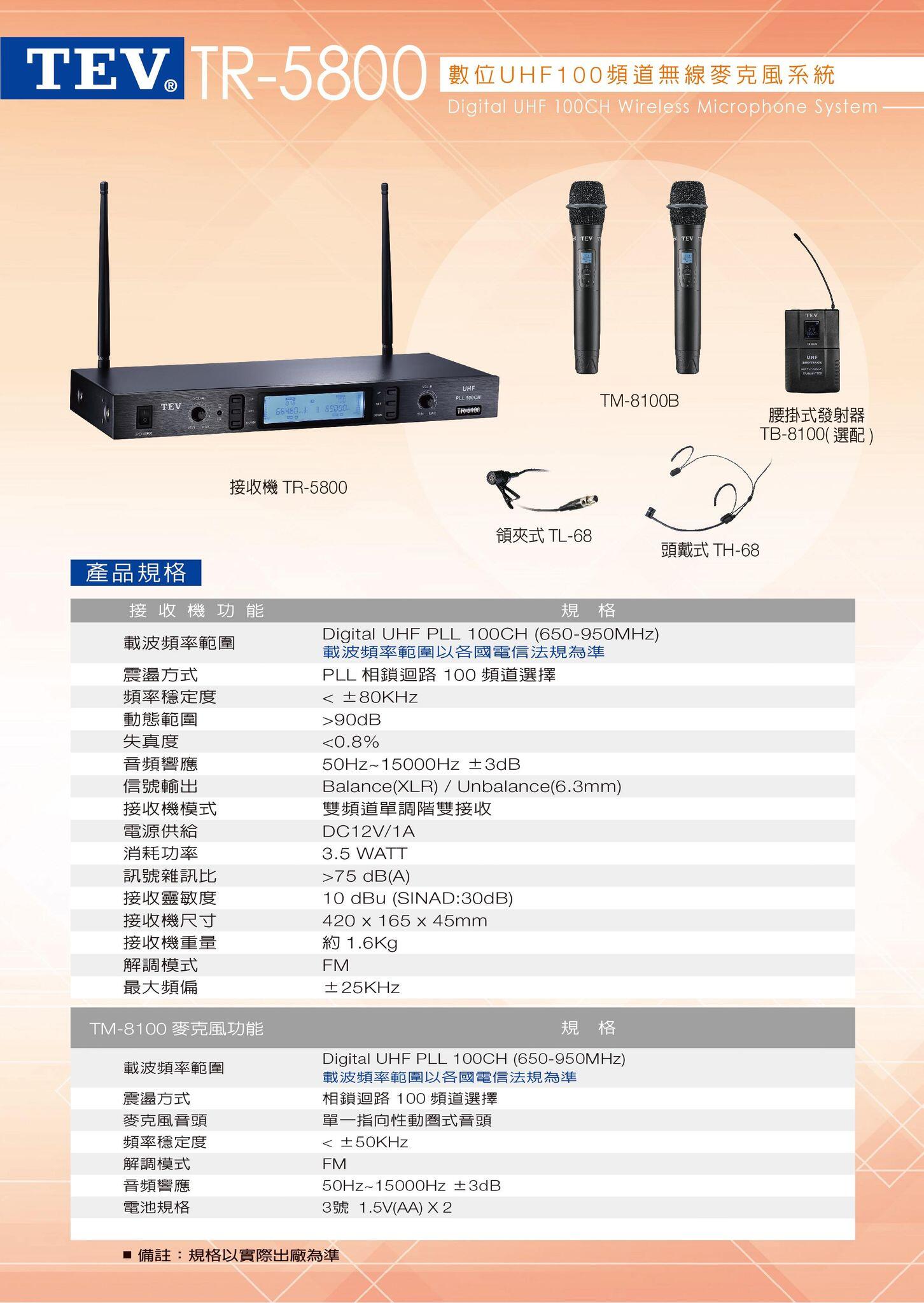 | KTV 卡拉OK專用 UHF 100CH無線麥克風 TR-5800 | 267.41 KB | 2020-12-28 |